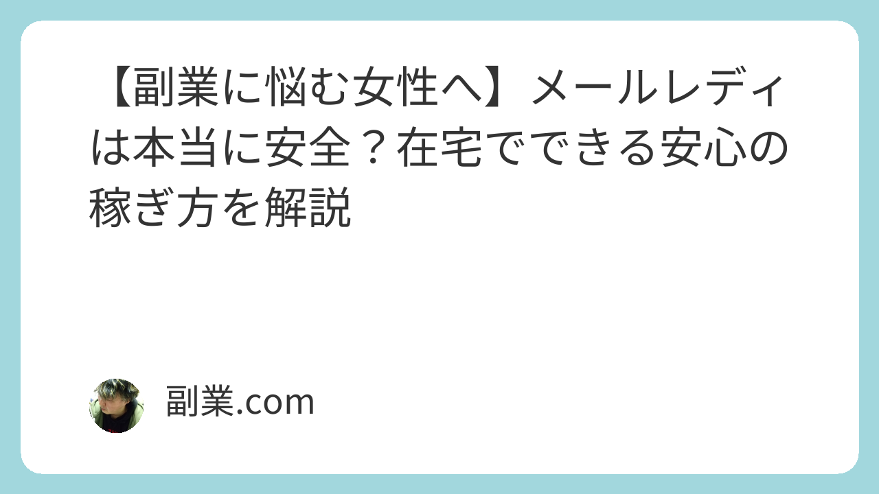 副業、女性、メールレディ、安全という4つのキーワードに当てはまる働き方を探している方には、メールレディは非常に相性の良い在宅ワークです。顔出し不要・トーク不要・スマホだけで稼げるため、プライバシーを守りながら取り組める点は大きな魅力です。重要なのは、安全なサイト選びと無理のないペースで続けること。しっかり準備して始めれば、毎月のプチ収入として長く続けられる副業になるでしょう。