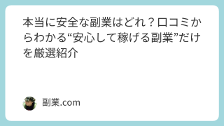 「危険な副業に騙されたくない…」「口コミで評判の良い“本当に安全な副業”だけ知りたい」副業ブームの今、安全性の低い案件も増えています。そこで今回は、実際の口コミをもとに安心して始められる副業だけを厳選して紹介します。口コミからわかる「安全な...