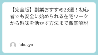 副業 【完全版】副業おすすめ23選!初心者でも安全に始められる在宅ワークから趣味を活かす方法まで徹底解説 副業を始めたい方必見!スキル不要で今すぐ始められる副業から、趣味を活かした収入アップ術まで幅広くご紹介。会社員でも安心して取り組める在宅ワークや注意点も詳しく解説します。あなたにぴったりの副業おすすめを見つけて理想の働き方を実現しましょう。 2025.11.10 副業