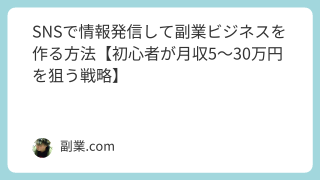 副業 SNSで情報発信して副業ビジネスを作る方法【初心者が月収5〜30万円を狙う戦略】 SNSは、今もっとも始めやすく、初期費用ゼロで収益化できる副業として人気です。特に情報発信ビジネスは、個人でもSNSアカウントを育てることで安定的に収益を作ることができます。この記事では、SNS情報発信で稼げる仕組み、どのSNSを選ぶべきか... 2025.11.24 副業