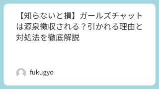 「ガールズチャットの報酬って源泉徴収されるの?」「税金が引かれてるんだけど…」「そもそも源泉徴収って何?」そんな疑問を抱えて検索した方に向けて、この記事ではガールズチャットと源泉徴収の仕組み・税金が引かれる理由・確定申告で損しない対処法をわ...