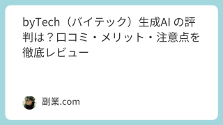 「生成AIを学んで副業に活かしたい」「AIツールを使って業務効率化したい」――そんな人に注目されているのが byTech(バイテック)生成AI です。ただ、受講を検討するなら「評判はどうか」「実際に使えるか」「デメリットは?」を知っておきた...
